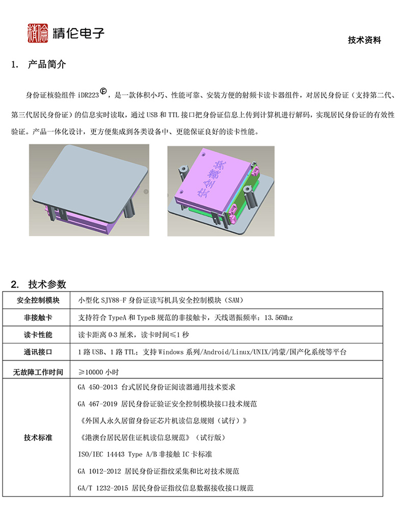 (*由于產品升級或其他原因,精倫IDR223身份證組件產品實際參數有可能變更,以實際產品為準。本文中的所有陳述、信息和建議也不構成任何明示或暗示的擔保)